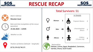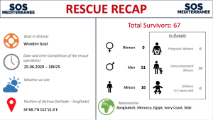 – On June 25, Ocean Viking rescues 51 people from a wooden boat in distress in the morning and rescues 67 people from another wooden boat in distress by the end of day.