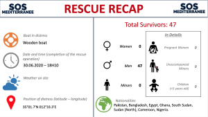 – On June 30, Ocean Viking rescues 47 people from a wooden boat in distress at the end of day and rescues 16 people from a fiberglass boat in distress late at night.