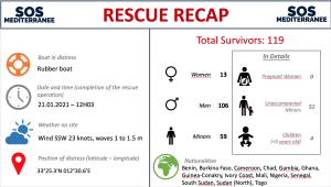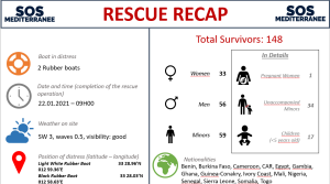 On January 21, the Ocean Viking rescued 119 people from a rubber boat in distress, 37NM off the Libyan coast. On January 22, the vessel rescued further 148 people from two rubber boats in distress, 37 NM off the coast and later on the same day, a fourth rubber boat in distress was spotted and 106 people rescued at nightfall 28 NM off the Libyan coast.