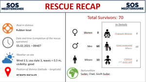 On February 5, in the morning, the Ocean Viking rescued 70 people from a rubber boat in distress 40 NM off the Libyan coast and 116 people from a second rubber boat in distress within a few hours.