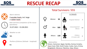 On August 1, Ocean Viking completes two rescue operations: a critical rescue of a large wooden boat in distress is performed in the night from July 31st and August 1 in coordination with two other SAR NGOs: Sea-Watch and ResQship. 253 people are safely brought onboard Ocean Viking. In the afternoon, Ocean Viking rescued 106 people from a wooden boat in distress. Following the latest operation, Ocean Viking sends an email to MTRCC, TNMRCC and LYJRCC (with ITMRCC in copy) requesting a place of safety for the 555 survivors onboard.