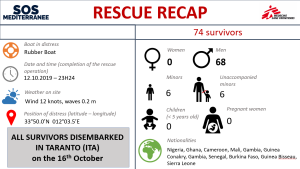 – On the 12th of October, Ocean Viking rescued 74 people from a rubber boat in distress in the International waters of the Libyan Search and Rescue Region. The boat in distress was reported by Alarm Phone and later spotted by the FPSO at Al Jurf Oilfield, which informed Ocean Viking accordingly. Ocean Viking kept the Libyan JRCC continuously informed during the SAR event
