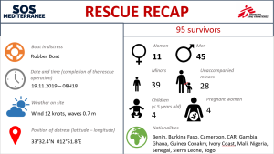 – On the 19th of November, Ocean Viking rescued 95 people from a rubber boat in distress in the International waters of the Libyan Search and Rescue Region. The boat in distress was reported by Alarm Phone to the Libyan JRCC in the morning and was spotted by Ocean Viking roughly two hours later. Ocean Viking kept the Libyan JRCC continuously informed during the SAR event