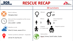 – On the 20th of November, Ocean Viking searched for a rubber boat reported by Alarm Phone. The boat was later intercepted by LNCG. Later the same day, Ocean Viking rescued 30 people from a fiberglass boat in distress in the International waters of the Libyan Search and Rescue Region. The boat was spotted by Ocean Viking and LYJRCC was informed accordingly before rescue took place