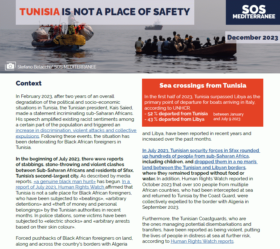 In February 2023, after two years of an overall degradation of the political and socio-economic situations in Tunisia, the Tunisian president, Kaïs Saïed, made a statement incriminating sub-Saharan Africans. His speech amplified existing racist sentiments among a certain part of the population and triggered an increase in discrimination, violent attacks and collective expulsions. Following these events, the situation has been deteriorating for Black African foreigners in Tunisia.